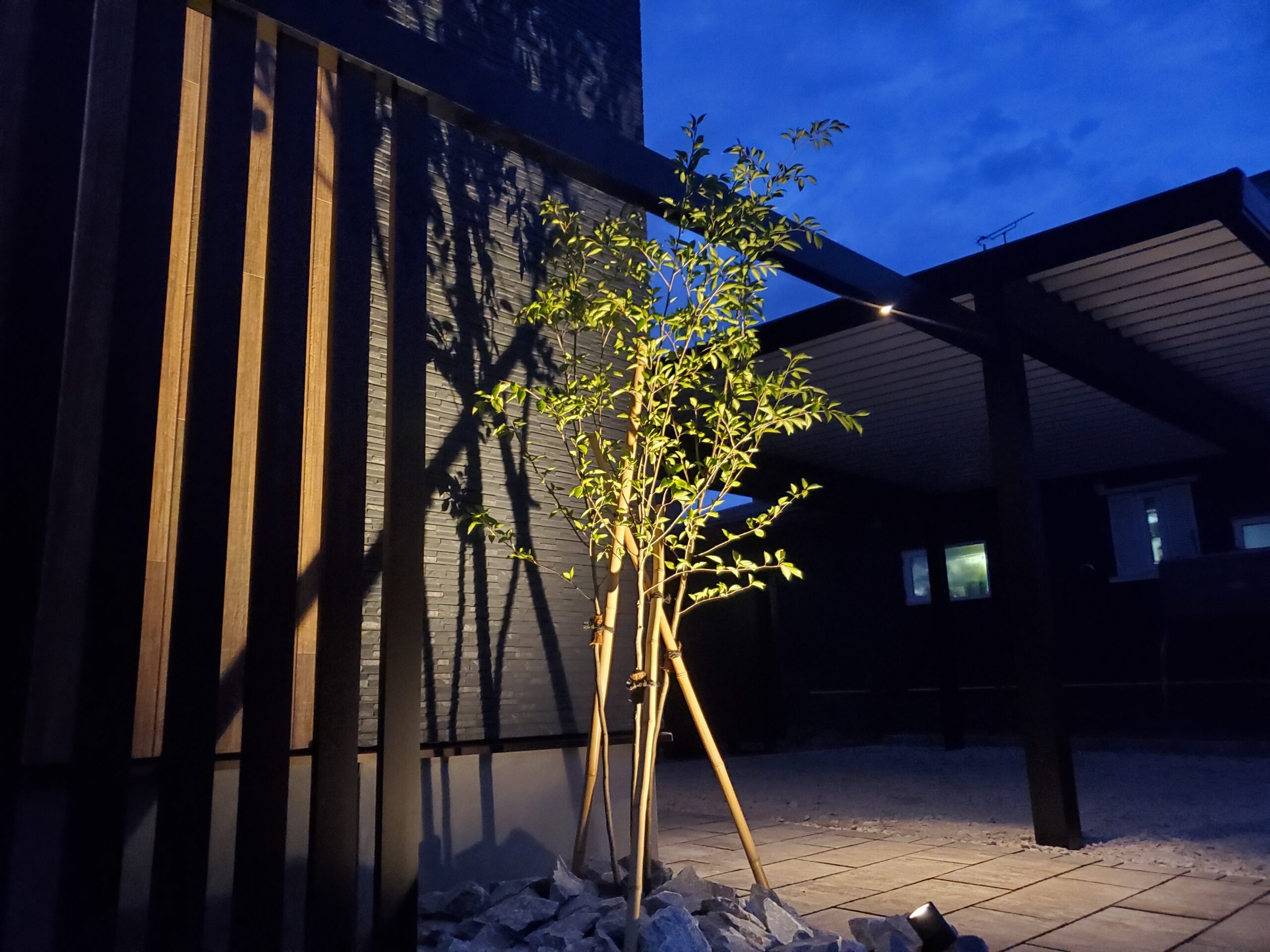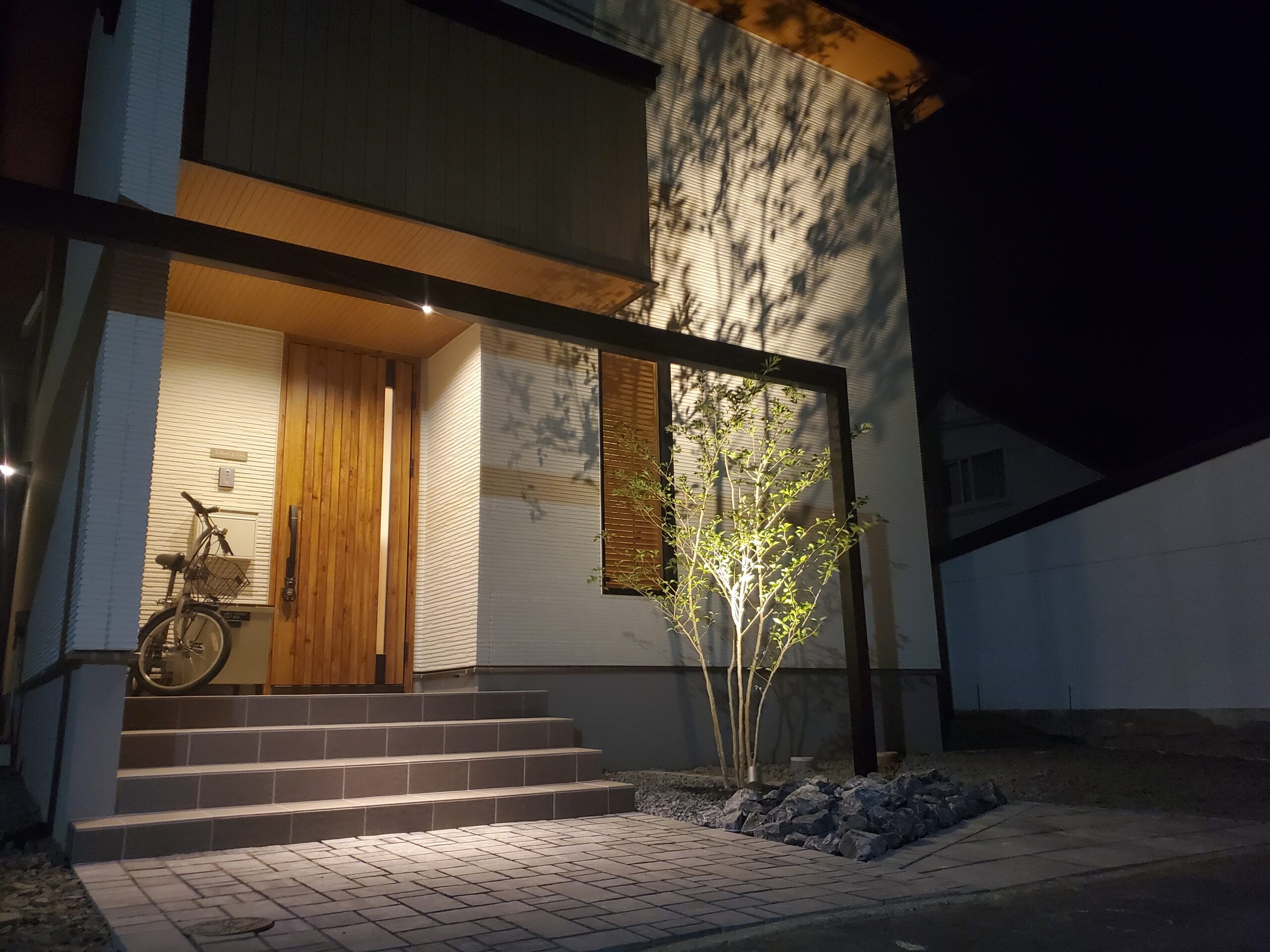 門柱には白系の塗壁と斜めデザインを取り入れ、植栽とライトアップによって昼夜で表情が変わるエントランスに仕上げました。