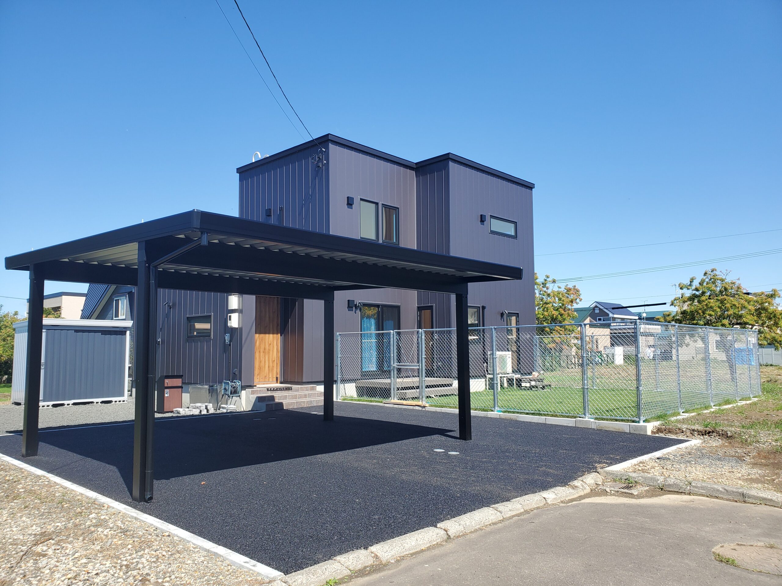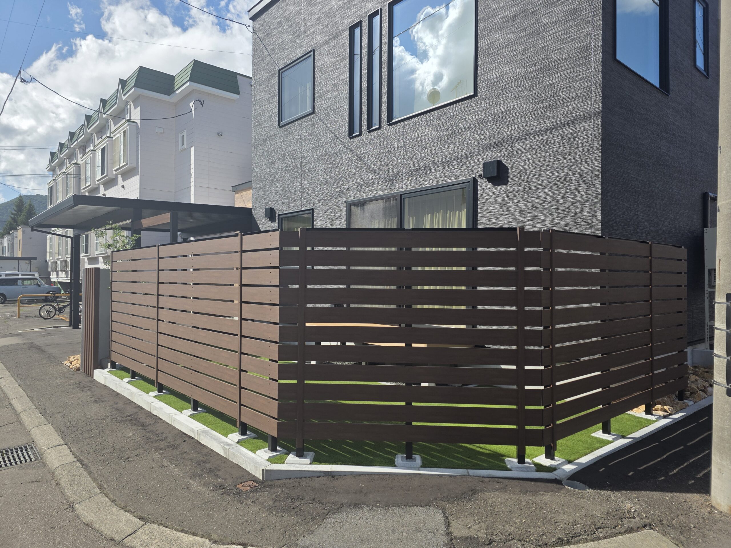 アスファルト舗装 フェンス 人工芝 リガーデン敷地廻りは樹脂フェンスで道路からの視線を遮りつつ、圧迫感のないプライベート空間を確保。