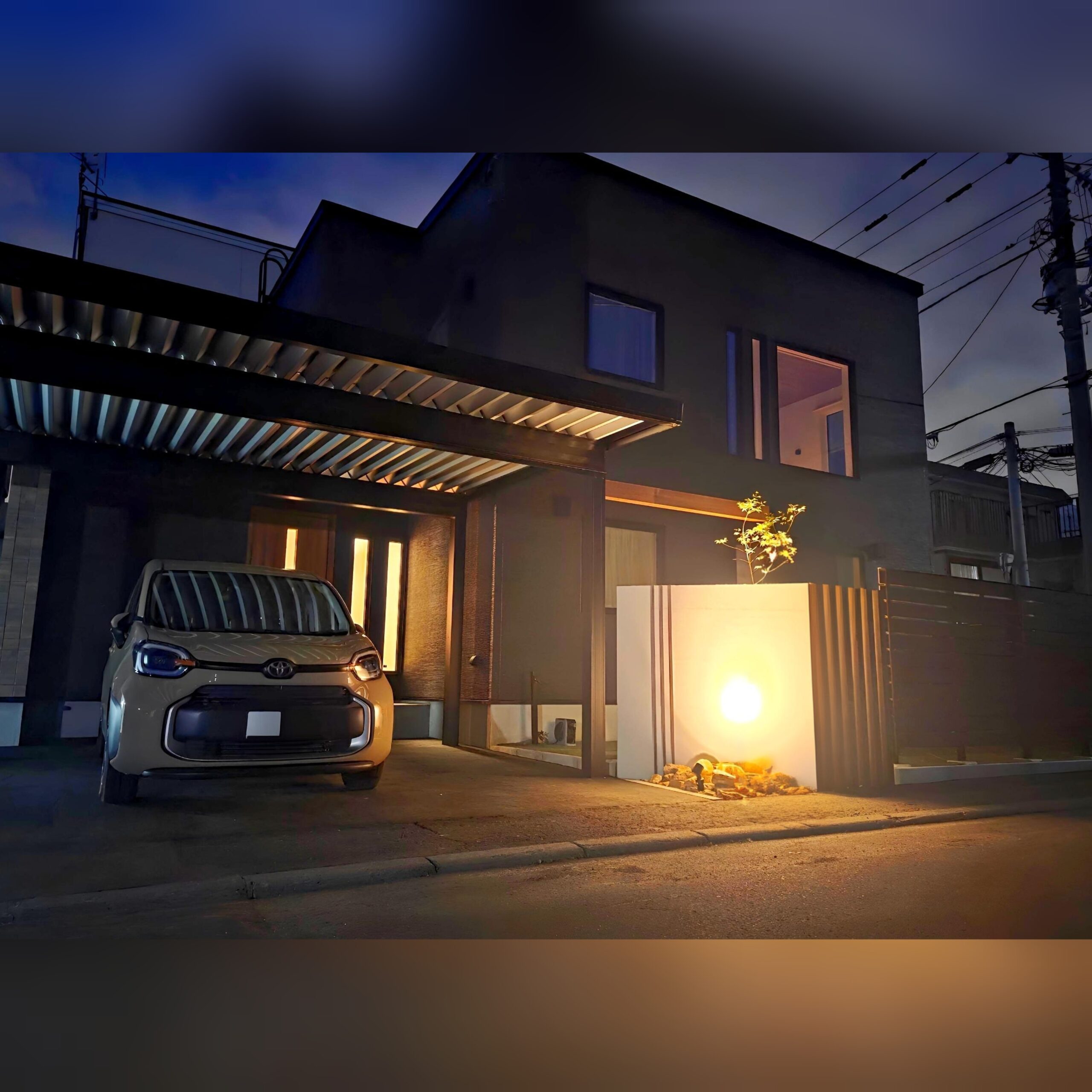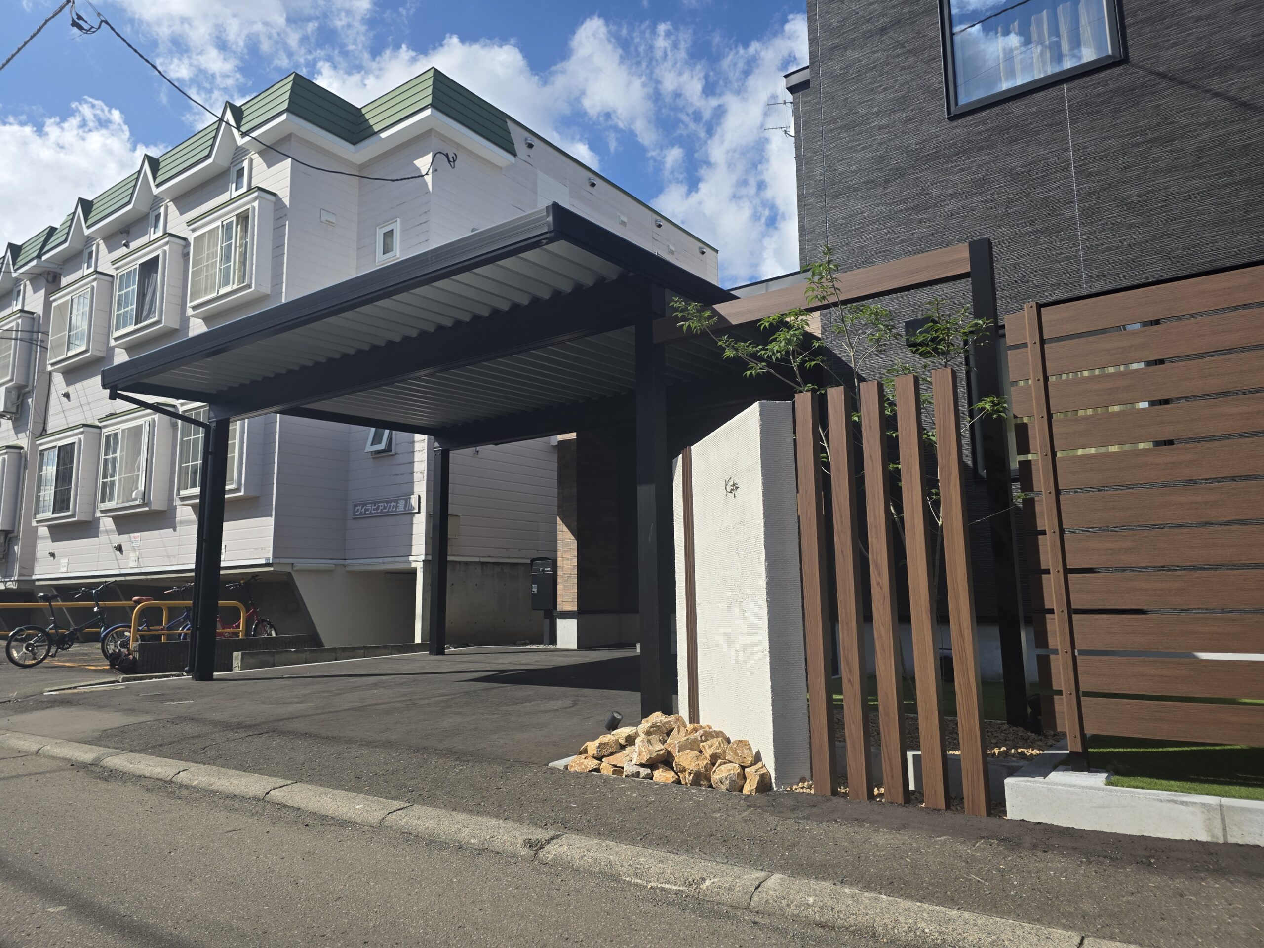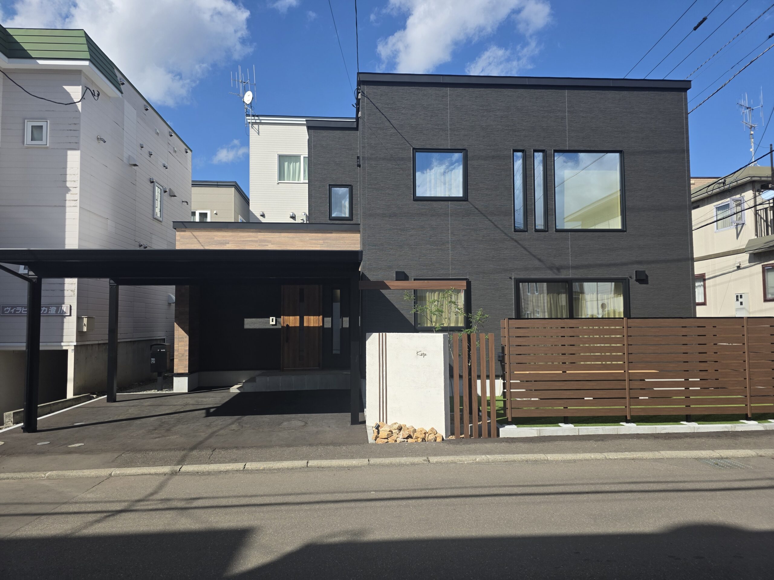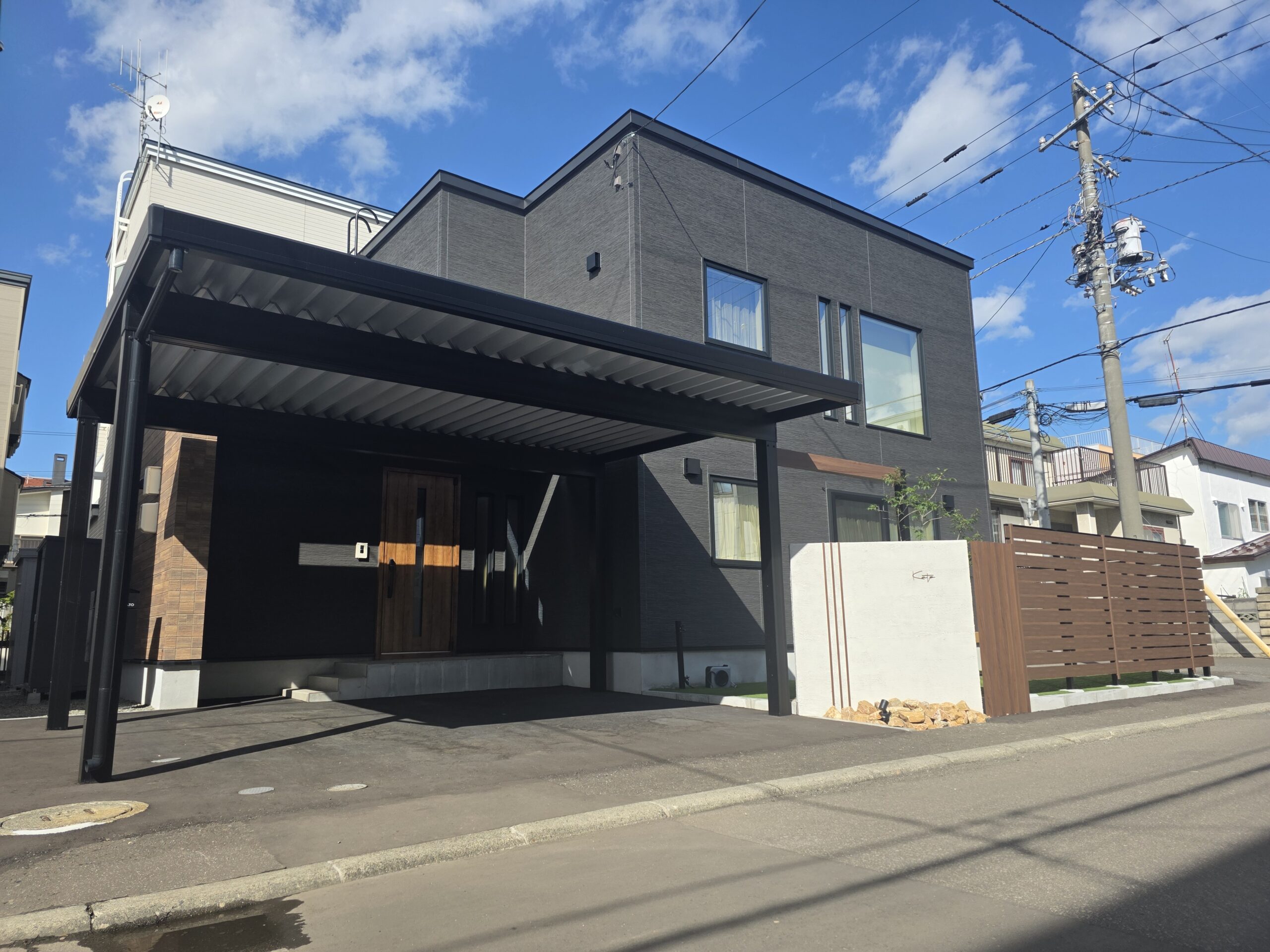 建物のシックな外観に合わせ、全体を直線美と斜めなデザインでまとめたモダン外構。