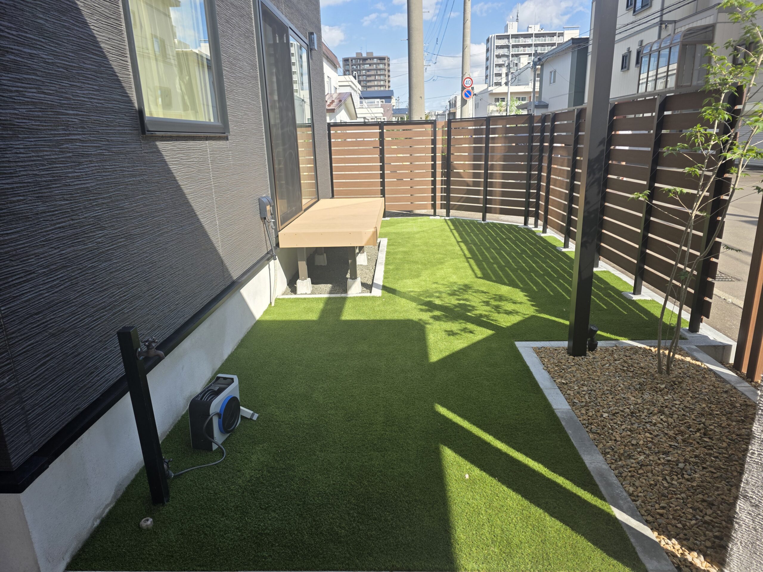 中庭には人工芝と樹脂デッキでメンテナンス性と使いやすさを両立。
