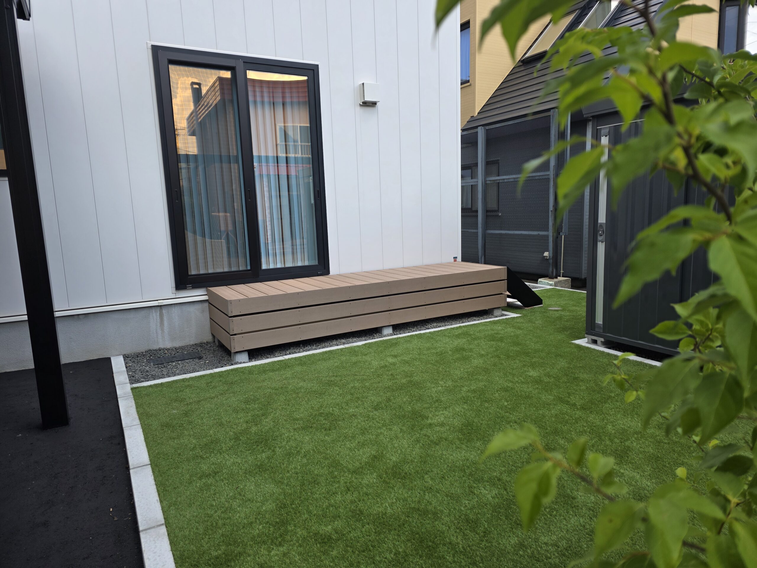 中庭には人工芝と樹脂デッキを施工し、プライベート性を確保しながら使い勝手の良い空間を確保。