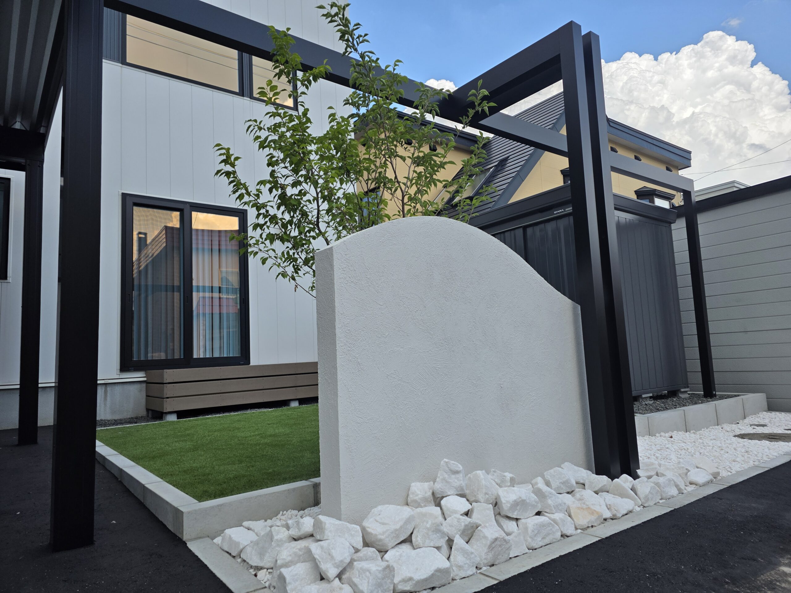 ホワイトの建物に、ブラックのアルミフレームと白のR門柱を基調としたミニマルなエクステリアに仕上げました。