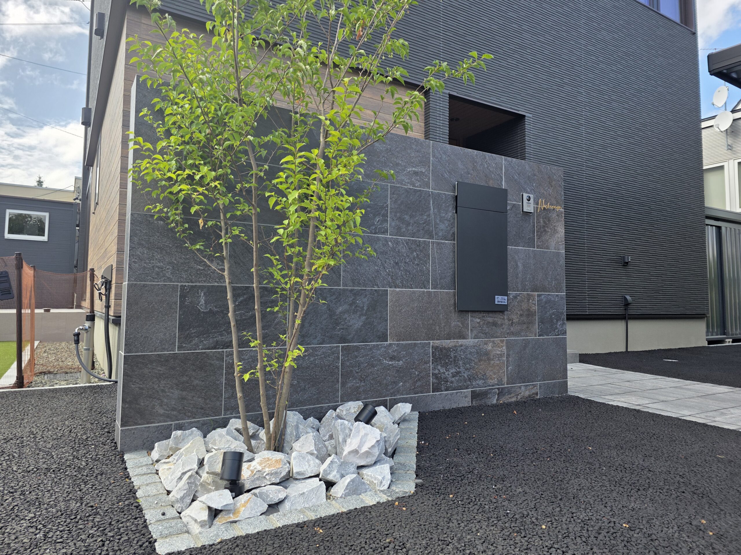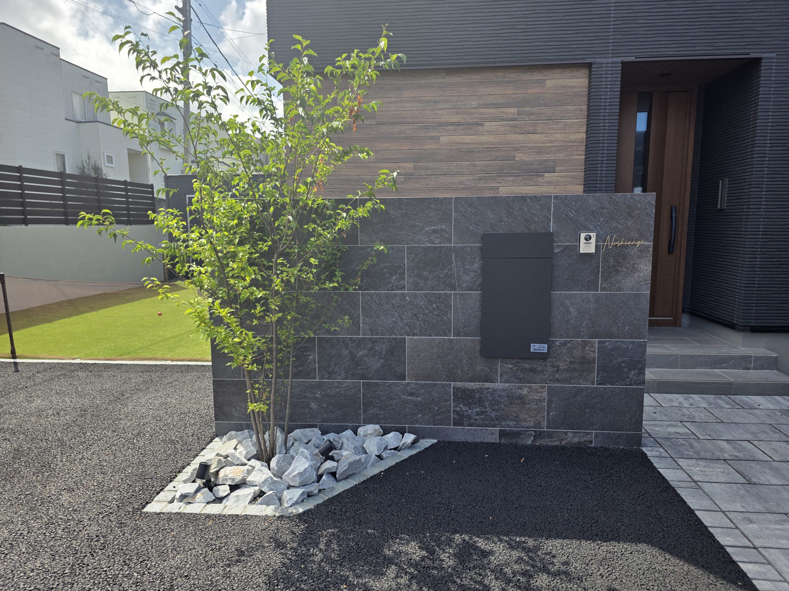 門柱にはダークトーンのタイルを使用して、宅配ボックスとインターホンを設置し、モダンな門柱デザインに仕上げました。
