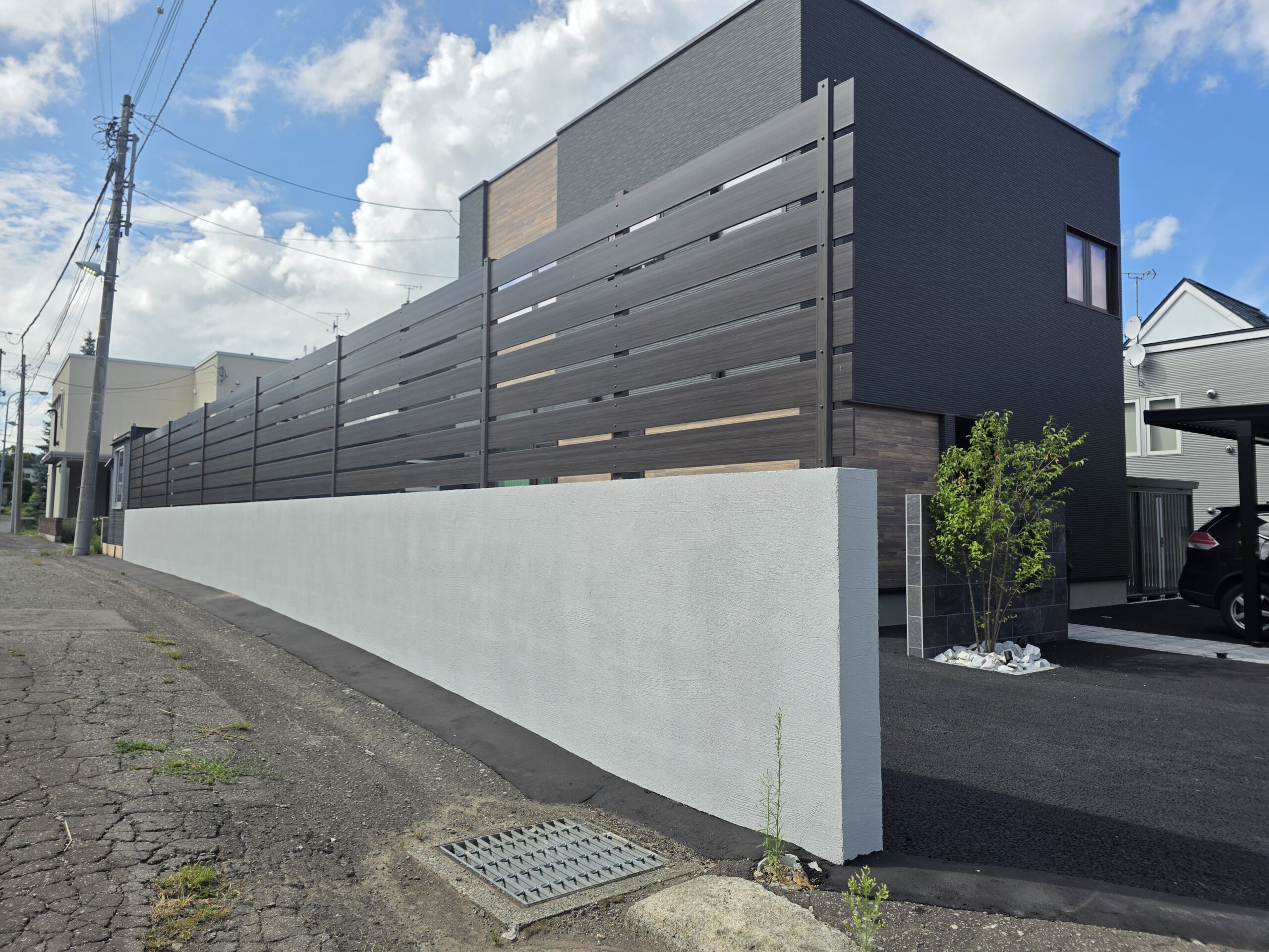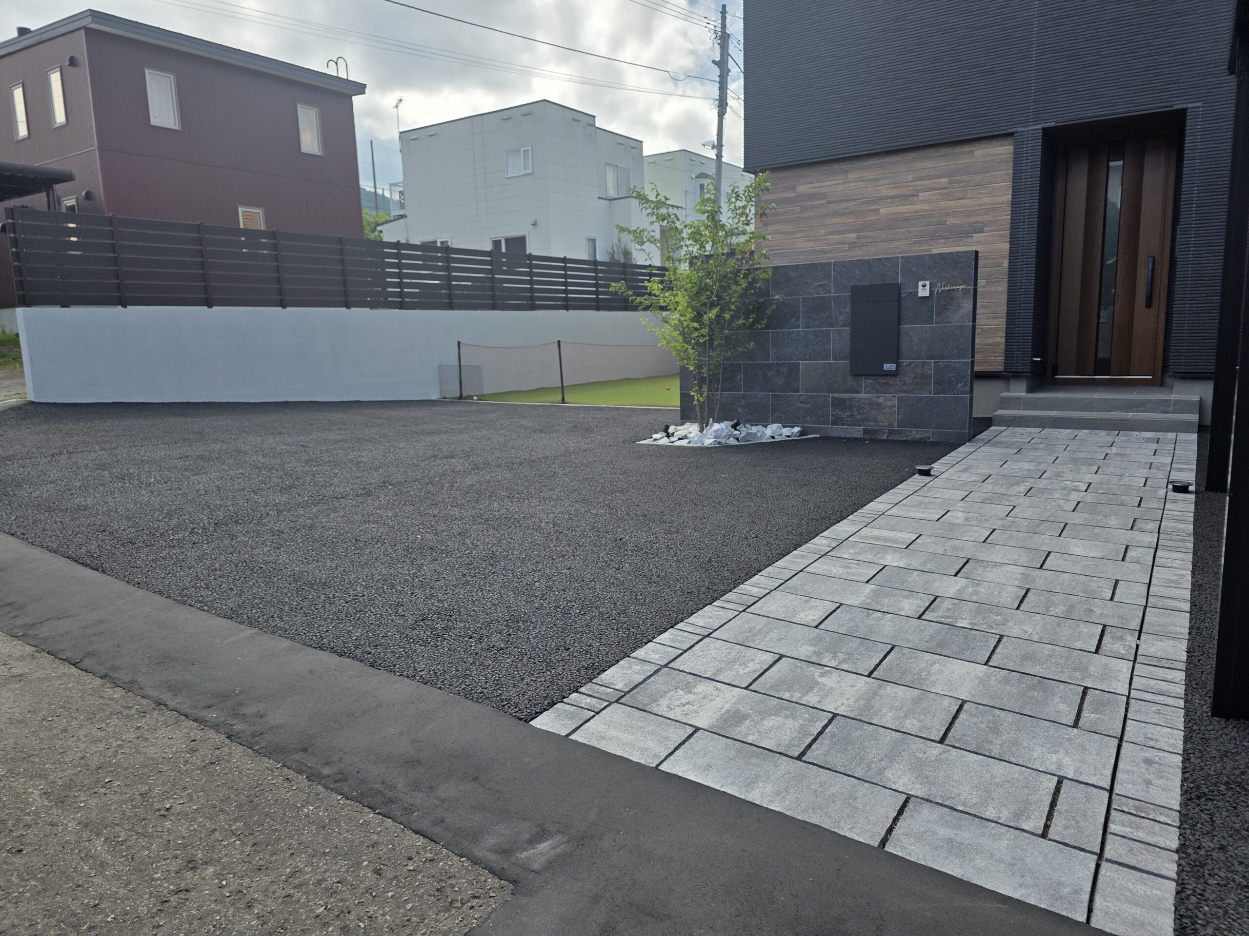 道路側は塀で高低差を解消し、塗壁塀に樹脂フェンスを組み合わせ、プライバシーを確保。駐車スペースは開粒アスファルトで水の流れを解消。