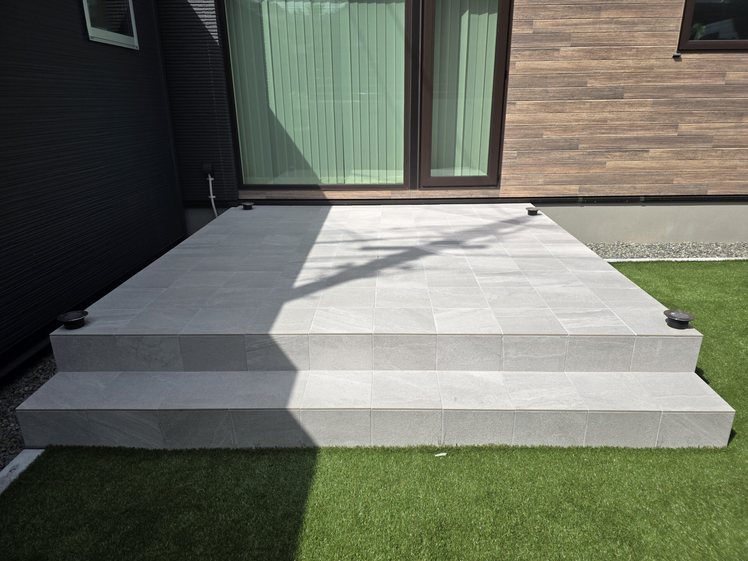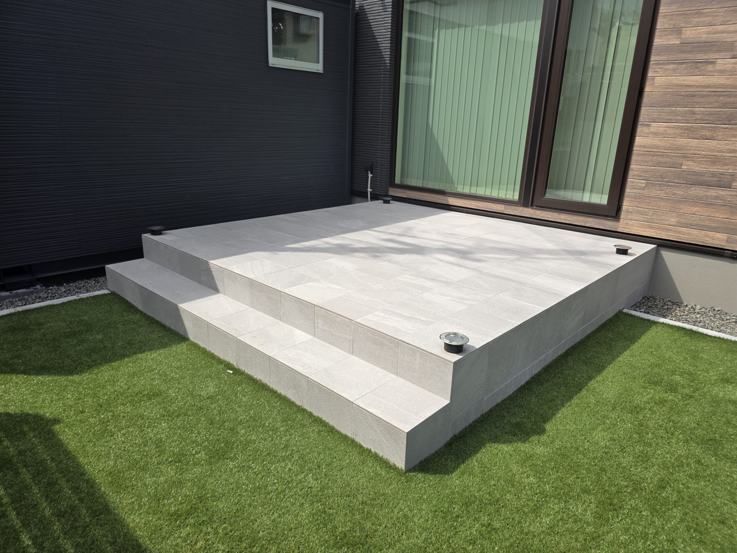 中庭には人工芝とタイルテラスを設け、メンテナンスフリーで長く快適な空間にいたしました。