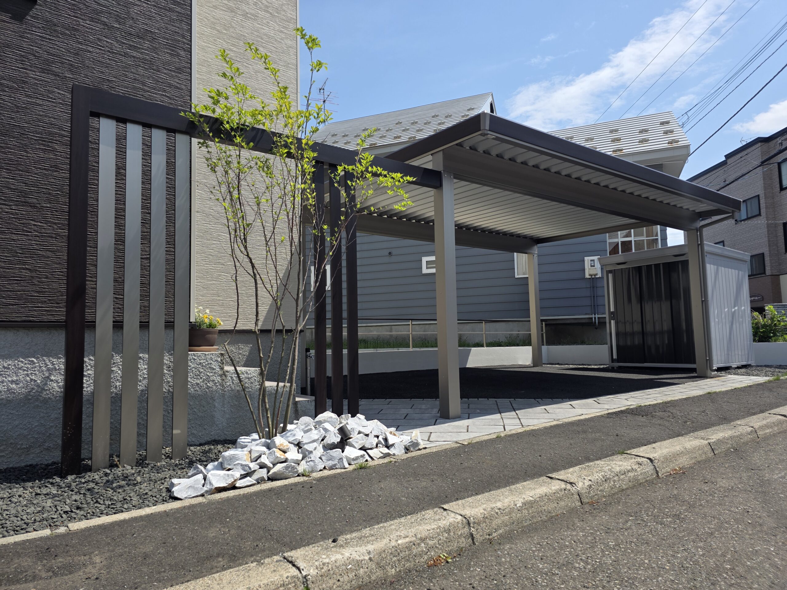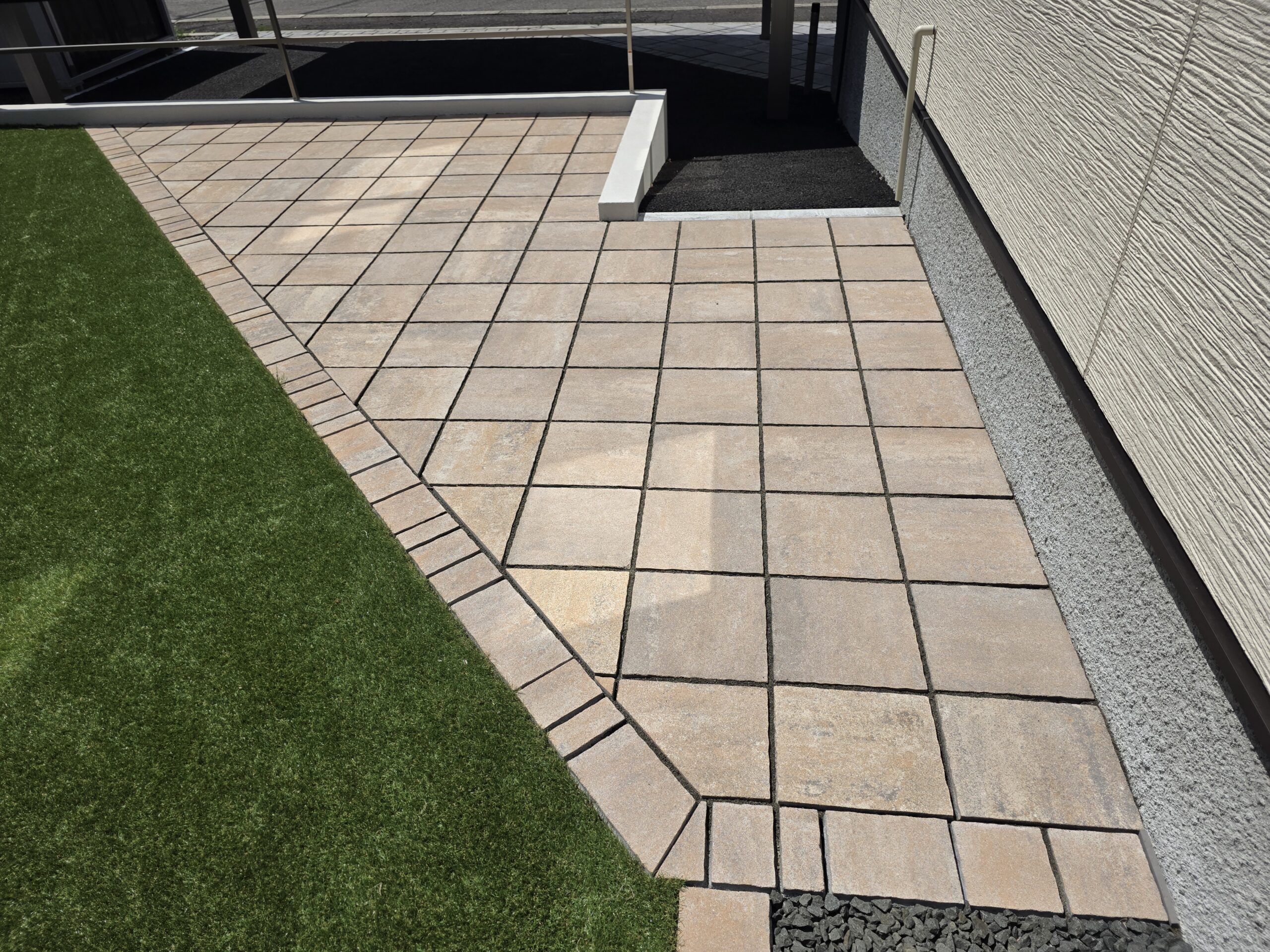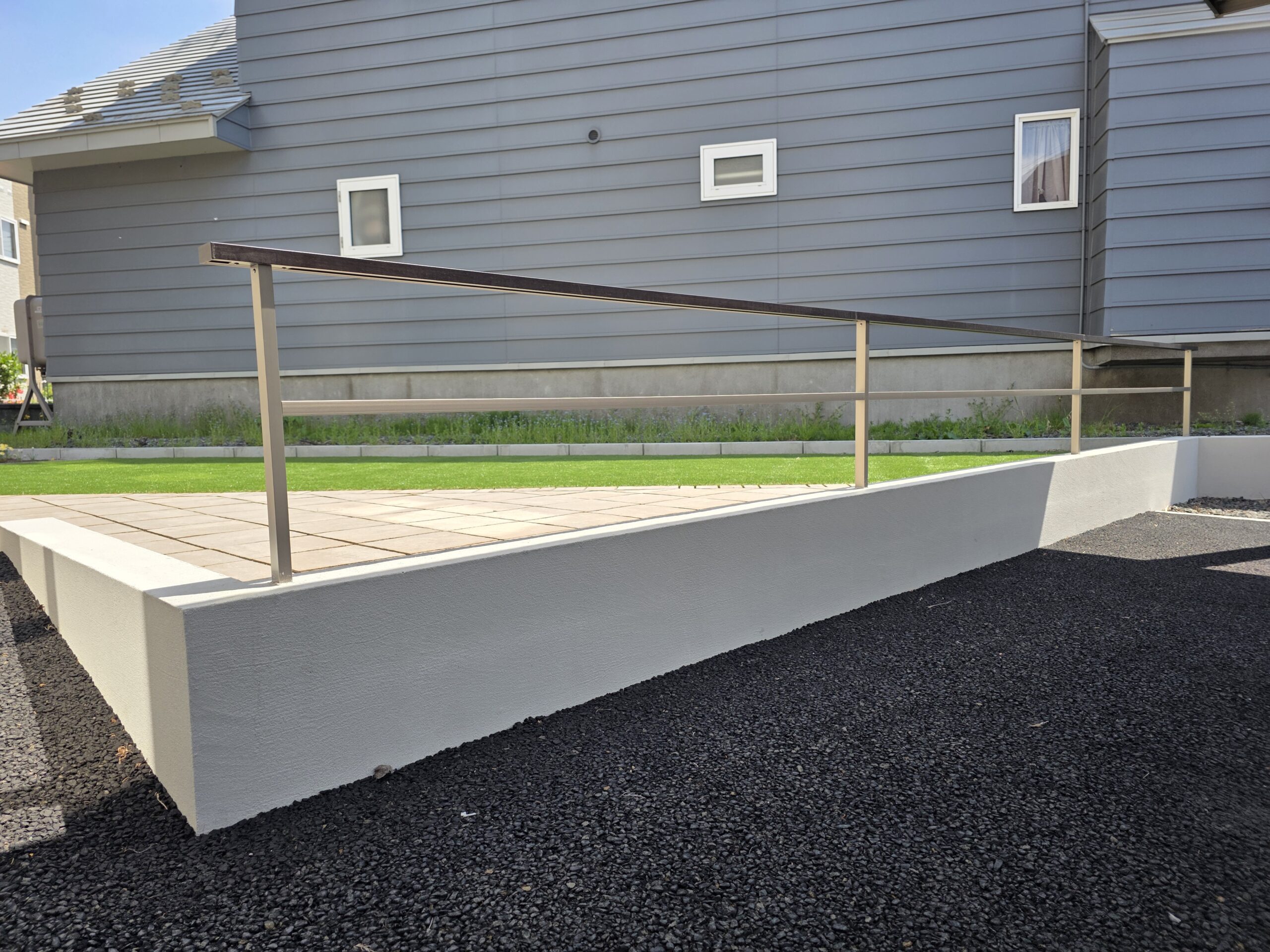 建物の雰囲気に合わせ、統一感のあるプランにいたしました。 アルミフレームと縦格子、植栽を組み合わせることで、視線を柔らかく立体感と上質さをプラス。 中庭部分には人工芝とバーベキュースペースを設置。 単調にならない斜めのデザインを採用し、一味違うスペースを施工。 落下防止のフェンスと塗り壁塀で高低差を解消して、お子様やご家族が安心して過ごせるエクステリアに仕上げました。