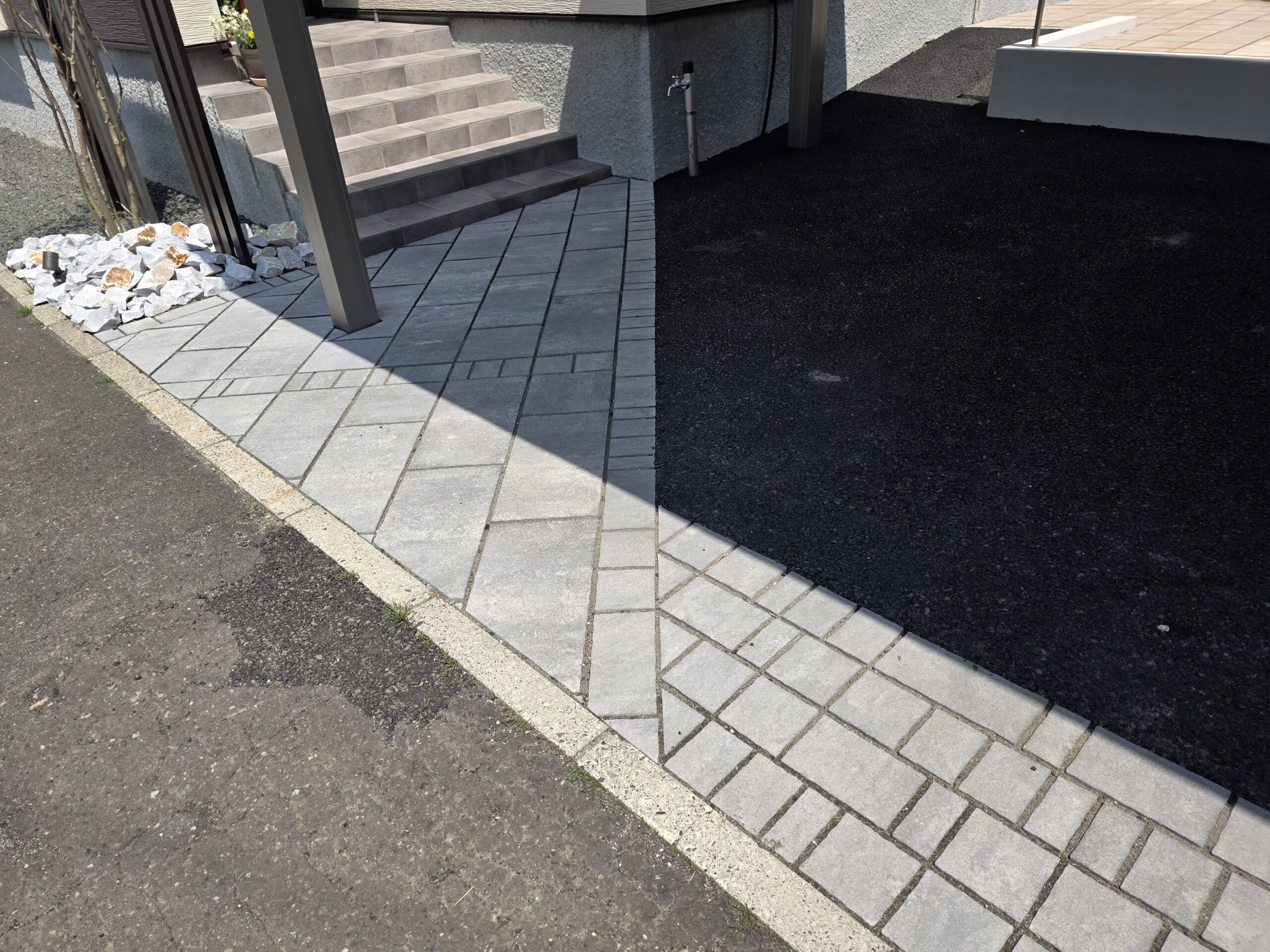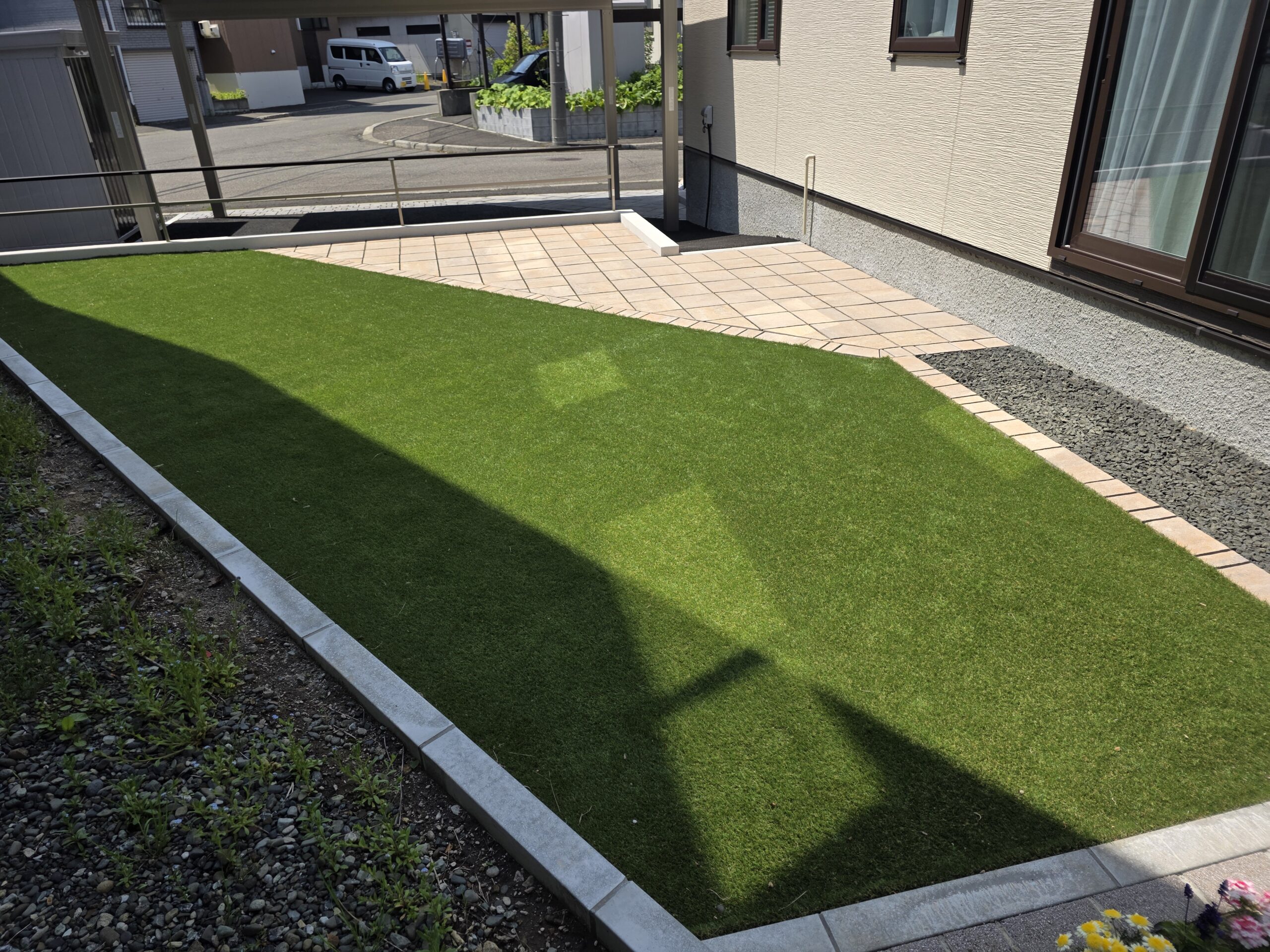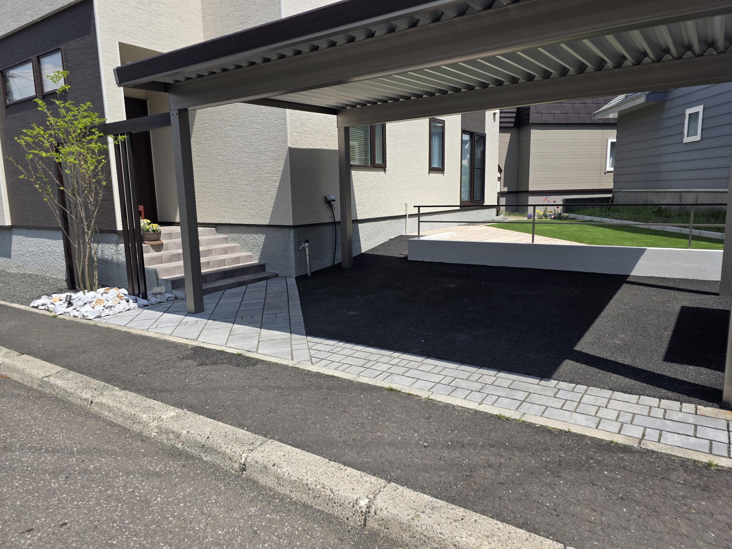 建物の雰囲気に合わせ、統一感のあるプランにいたしました。 アルミフレームと縦格子、植栽を組み合わせることで、視線を柔らかく立体感と上質さをプラス。 中庭部分には人工芝とバーベキュースペースを設置。 単調にならない斜めのデザインを採用し、一味違うスペースを施工。 落下防止のフェンスと塗り壁塀で高低差を解消して、お子様やご家族が安心して過ごせるエクステリアに仕上げました。