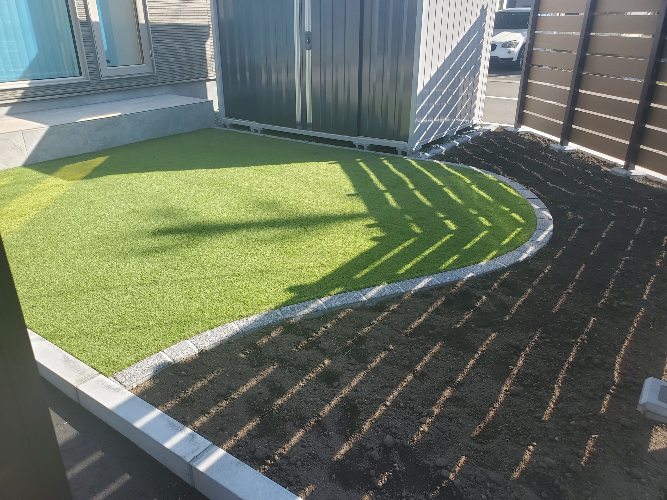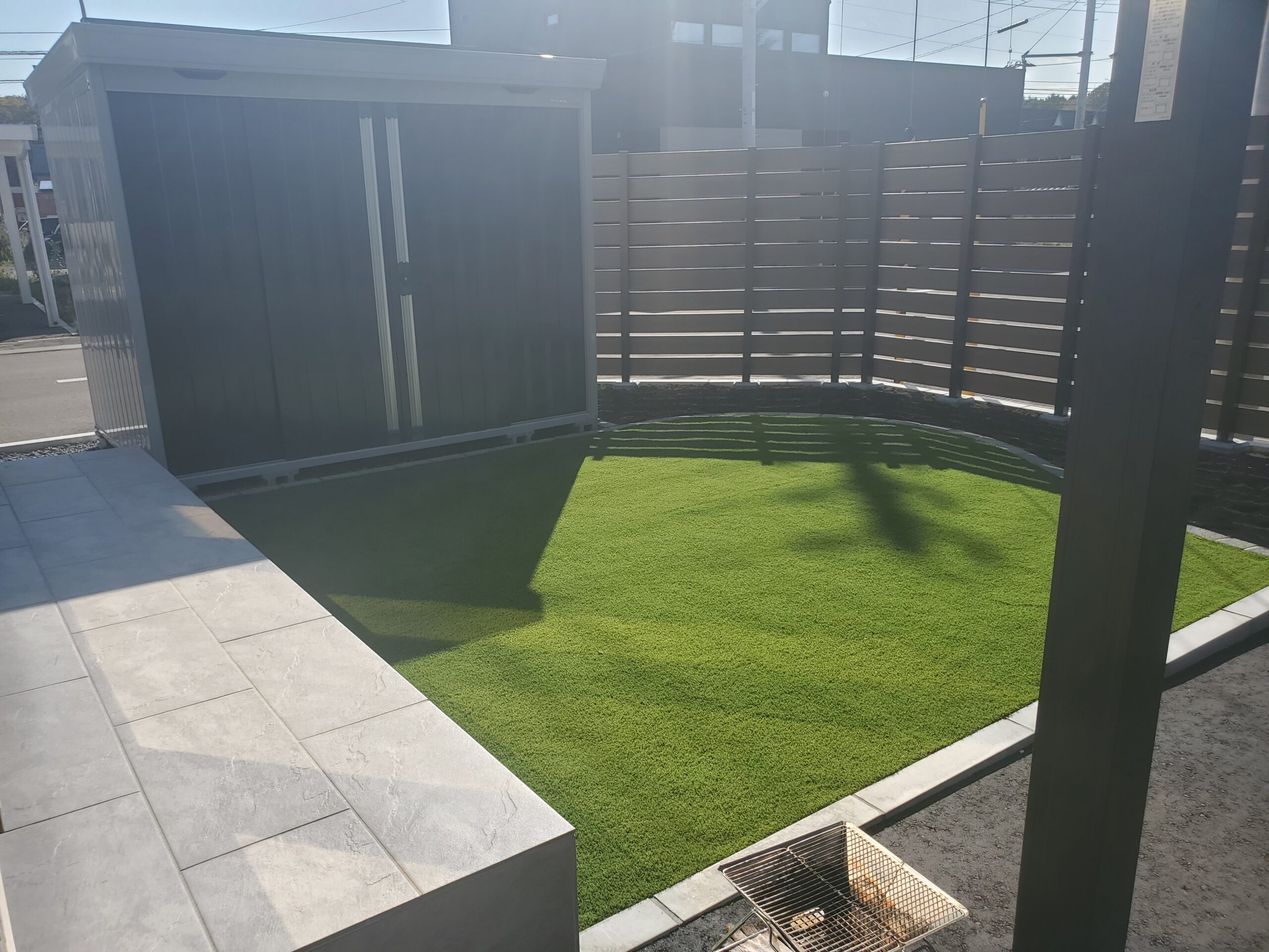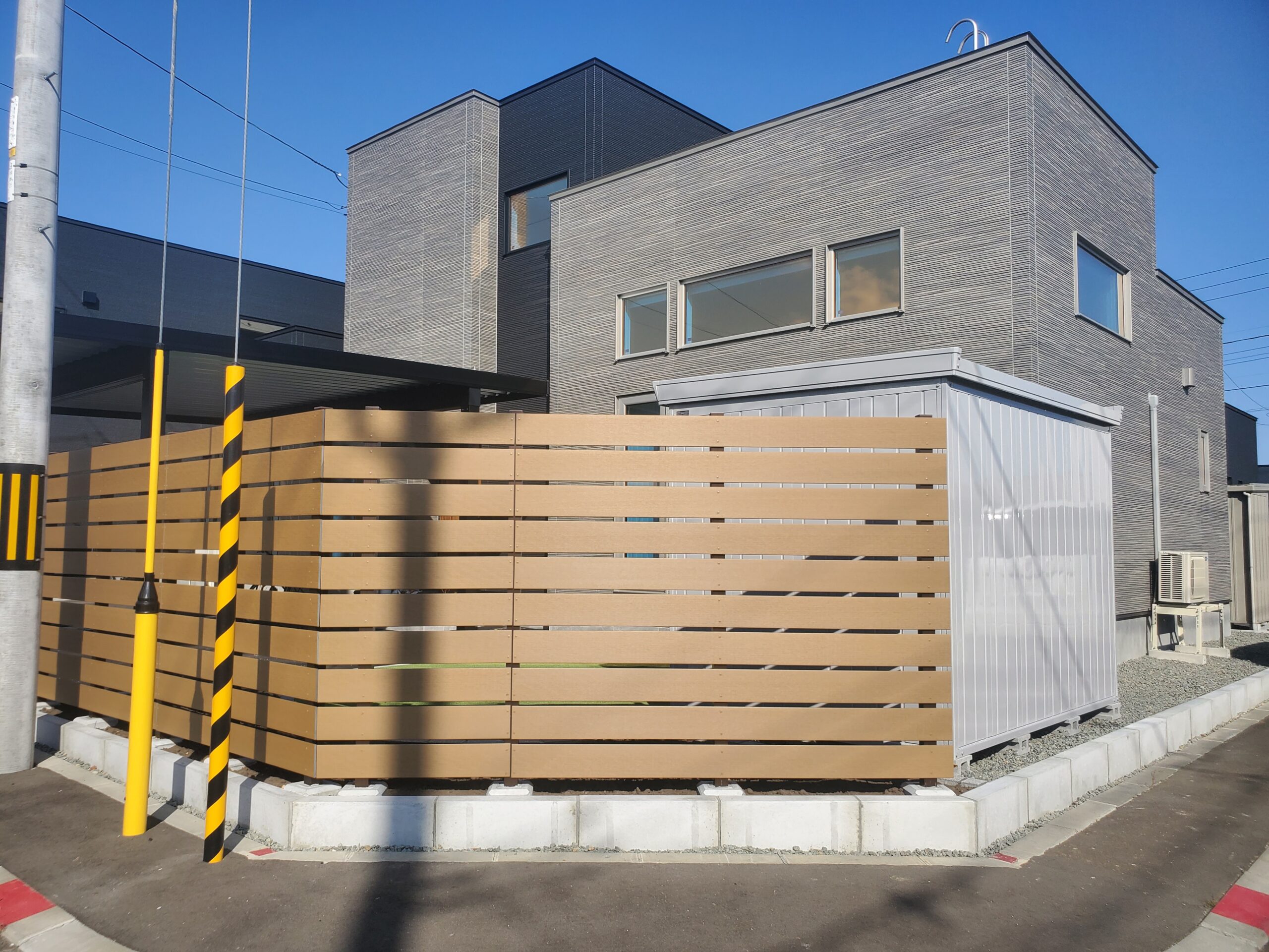 道路からの視線を考慮し、木調フェンスと物置を設置し、プライバシーも確保しております。