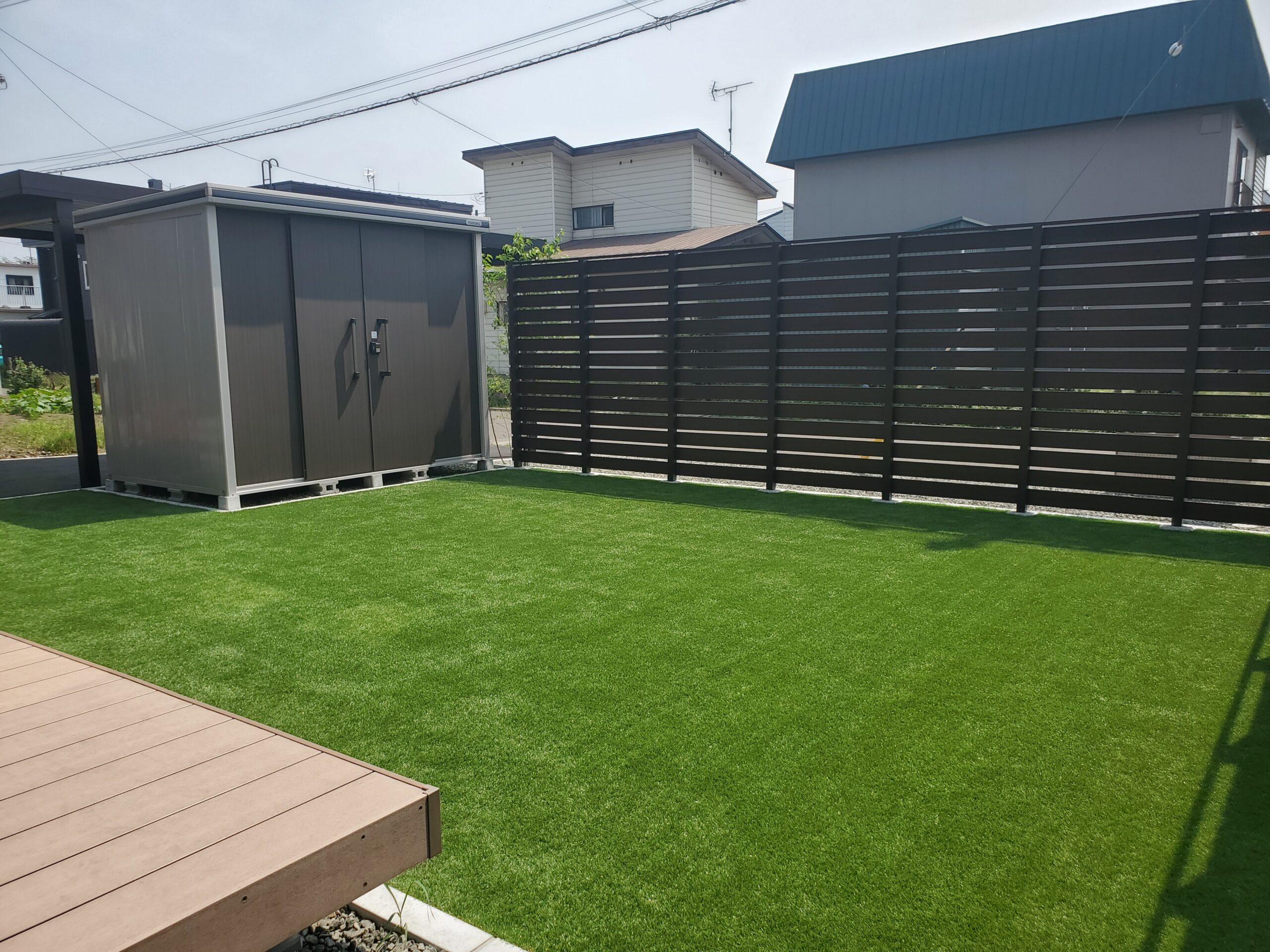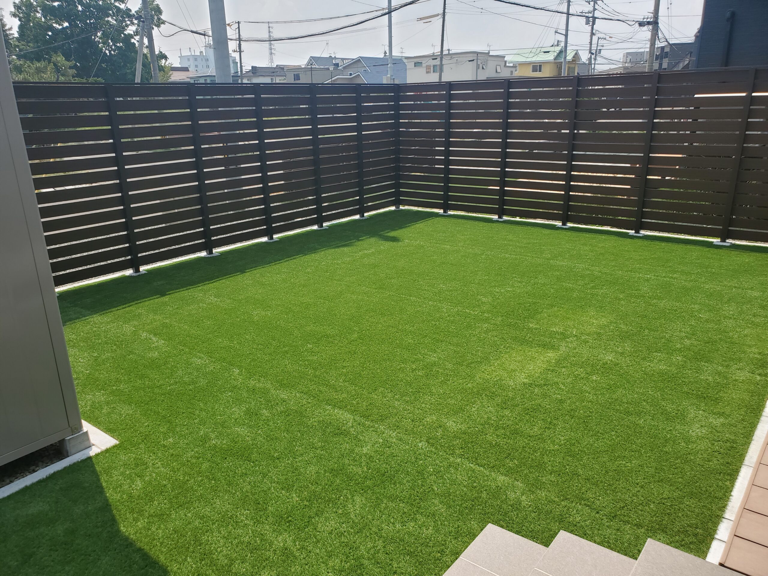 お庭部分には人工芝を敷設し、広々とした美しいプライベート空間を確保。心安らぐエクステリアに仕上げました。