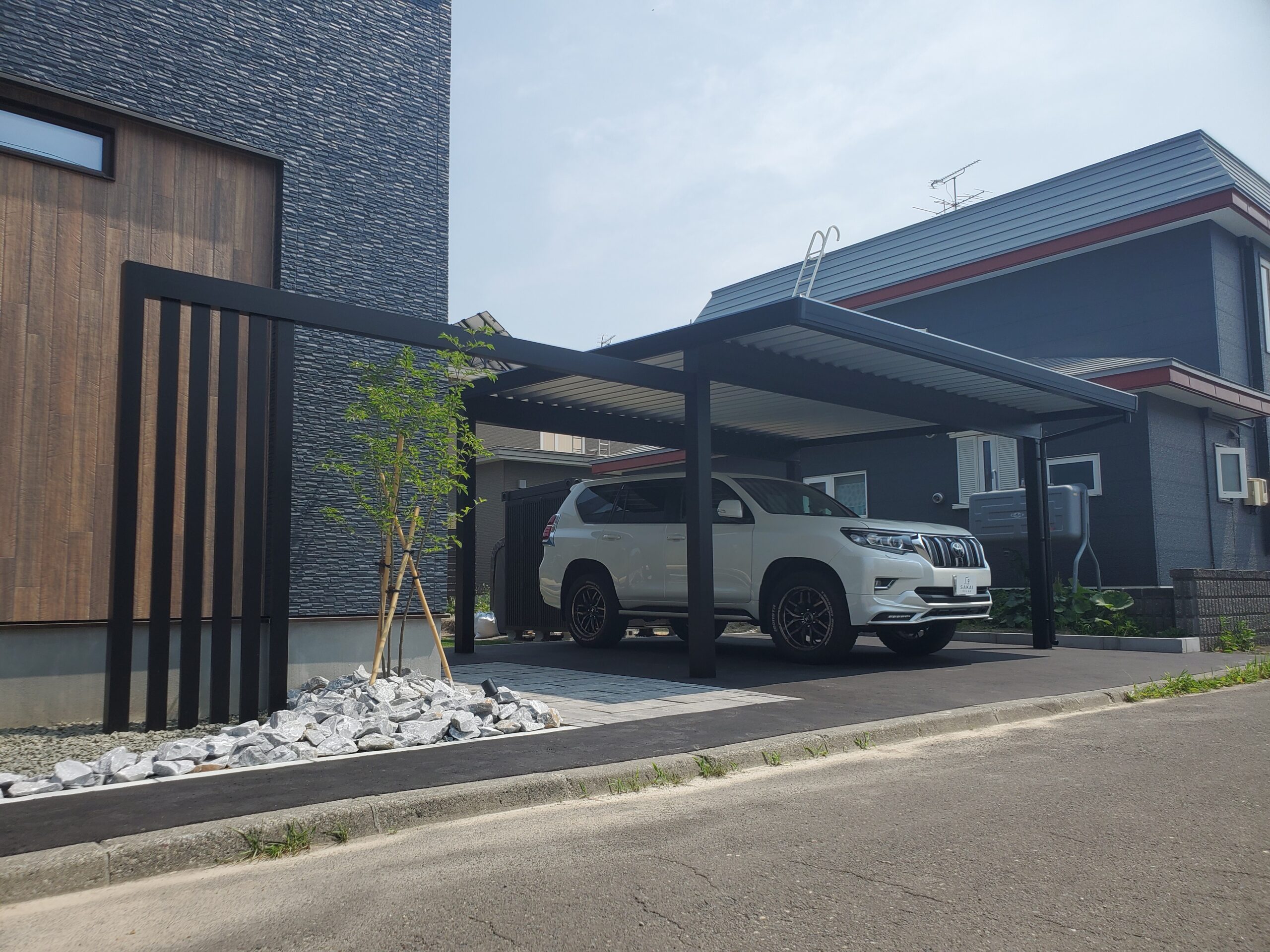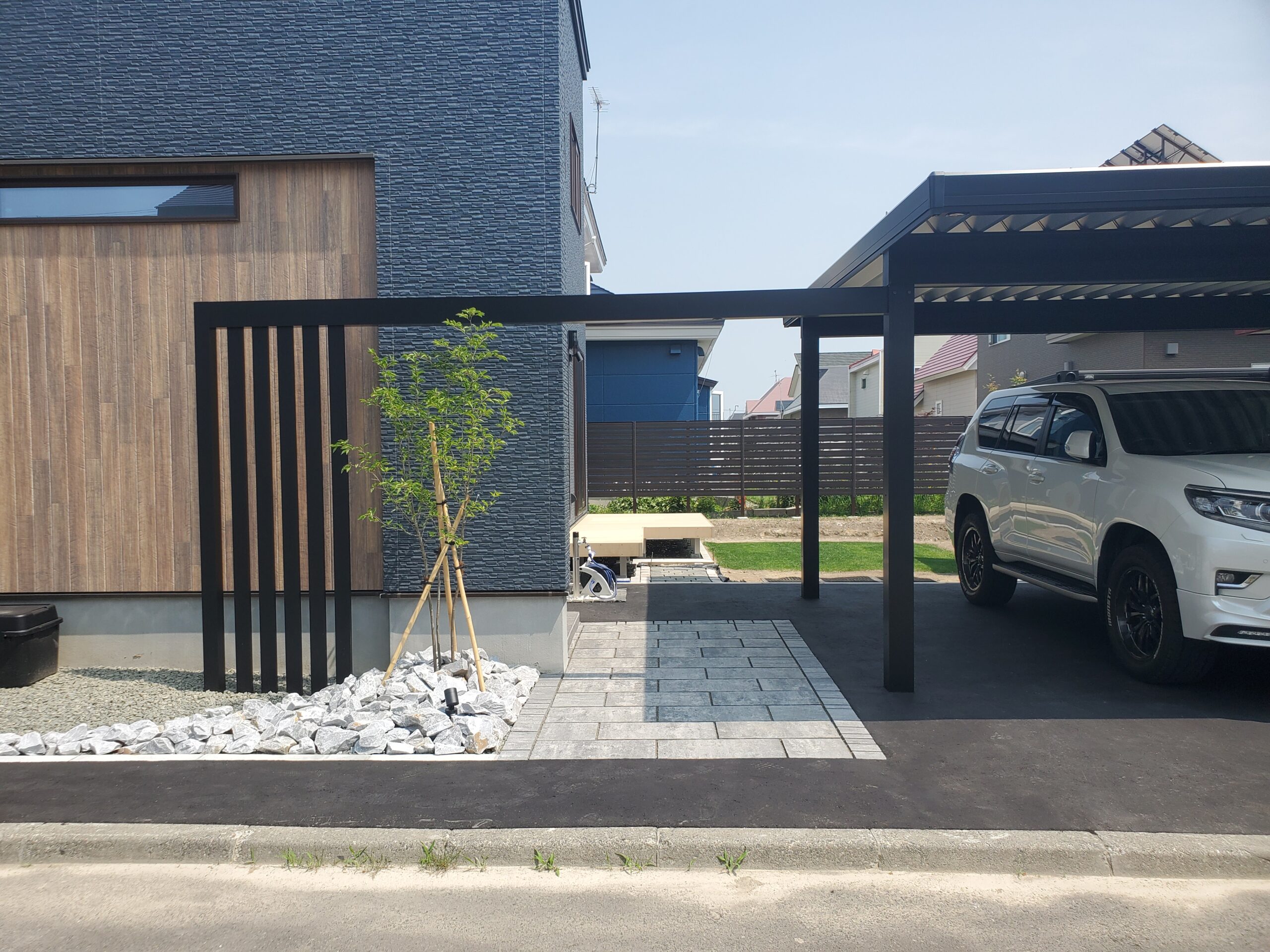重圧感と開放感を両立した、ブラック基調のモダン外構